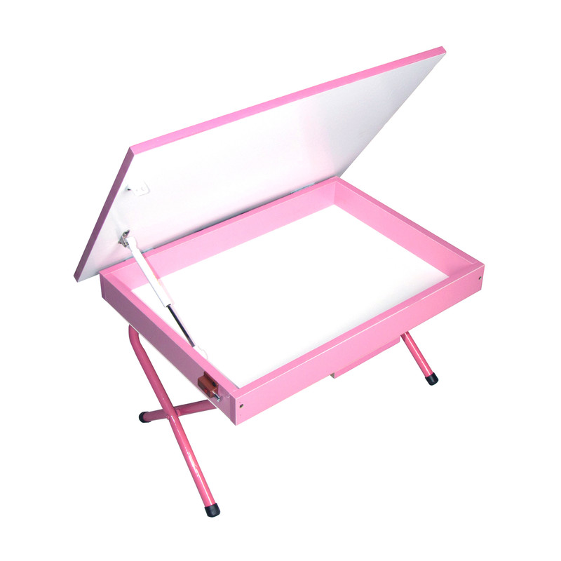 این میز تحریر رو زمینی و باکسدار می باشد و این باکس به وسیله ی ریلی که تعبیه شده باز می شود تا از باکس میز استفاده شود و نیازی نباشد که اجسام روی میز برداشته شوند تا لوازم درون باکس استفاده شود. فضای باکس بزرگ 57x37x6 سانتی متری زیر میز برای جاگذاری کتاب، لوازم تحریر و حتی لپ تاپ و سایر وسایل مناسب است و از به هم ریختگی کتاب ها و اتاق و سطح روی میز جلوگیری می کند. صفحه روی این میز به وسیله ی ریل باز می شود. طرح صفحه این میز وایت بردی و پرسی می باشد و کنده و جدا نمی شود. این میز تاشو و با قابلیت تنظیم ارتفاع از 35 تا 45 سانتی متر نسبت به سن مصرف کننده می باشد و قابلیت استفاده تمام سنین از 4 سال تا حتی بزرگسال را دارد. ویژگی این محصول وایت بردی بودن و کم جا بودن و تاشدن در هنگام عدم نیاز است. پایه ها از جنس لوله آهنی بسیار مقاوم با تحمل وزن بالای 50 کیلوگرم است و وزن میز 8 کیلوگرم می باشد. این محصول تماما ایرانی و با بالاترین کیفیت می باشد. موارد استفاده این میز مطالعه، کامپیوتر و لپ تاپ، کار، طراحی و نقاشی، میز وایتبرد، میز اداری و مدرسه، غذاخوری یک نفره می باشد. دیگر ویژگی های این میز سبک و قابل حمل آسان، قابلیت استفاده تمام سنین، قابلیت تنظیم ارتفاع، تحمل وزن بالای پایه، پرکاربرد بودن است.