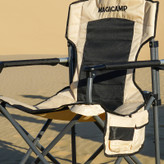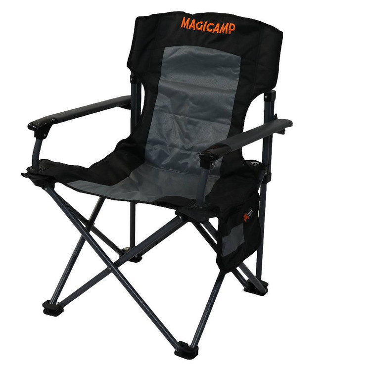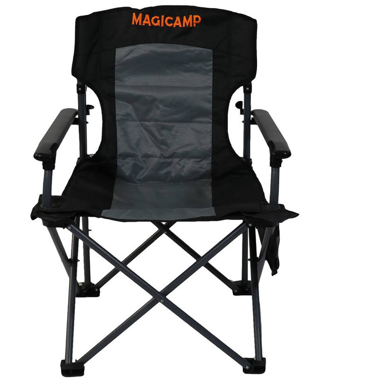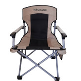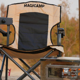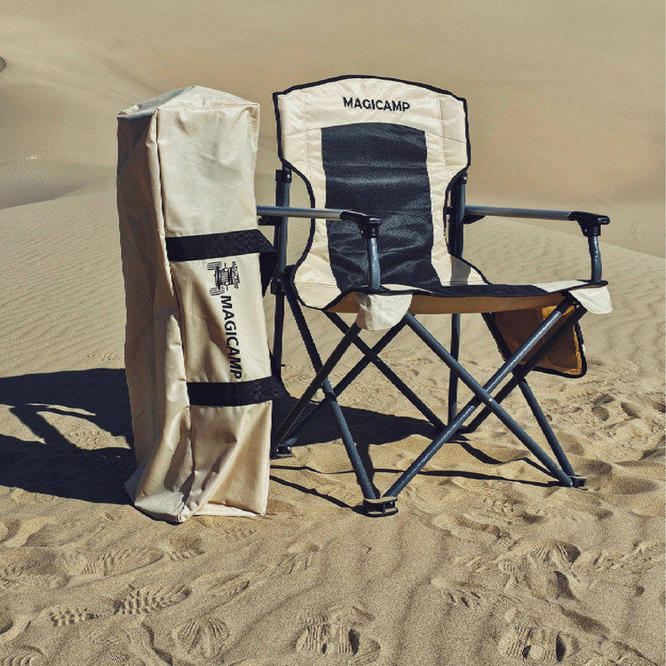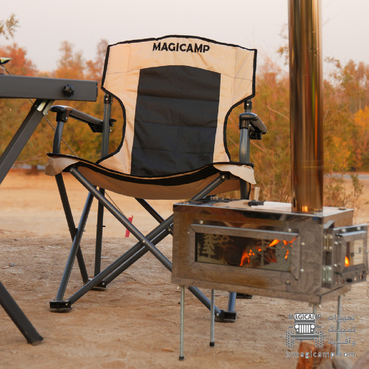 صندلی تاشو سفری ساخت ایران و گروه تولیدی میباشد و بهدلیل استفاده از بهترین و مقاومترین متریال در ساخت و تولید آن همراه با طراحی زیبا و شیک، کیفیتی مشابه و در حد صندلیهای اورجینال را دارد. جنس دستههای این صندلی از آلومینیوم 6063 بسیار بادوام است و مقاومت عالی در برابر خوردگی دارد. برای پایههای این صندلی از پروفیل صنعتی سایز 20 میلیمتر استفاده شده که این نوع پروفیل علاوه بر وزن کم و سبک آن، در برابر خوردگی و زنگ زدگی نیز مقاومت بالایی دارد و هنگام نشستن هم تعادل کاملی بین راحتی و پشتیبانی کاربر ایجاد میکند. برای پوشش رنگ قطعات فلزی صندلی لیدر مجیکمپ، از رنگ الکترواستاتیک کورهای استفاده شده است که این نوع رنگ بعد از پاشش بر روی قطعه فلزی، در کورهای با دمای 250 درجه حرارت داده میشود که این فرایند سطح مورد نظر را در برابر رطوبت، گرما و سایر شرایط آب و هوایی بسیار سخت و مقاوم میسازد و به همین دلیل است که کاربرد گستردهای در صنعت اتومبیل سازی، صنایع فلزی، لوازم خانگی دارد. جنس پارچه بهکار رفته در صندلی لیدر مجیکمپ ، جودون ضد آب (water proof) است که بافتی محکم و در عین حال نرم دارد و مقاوم در برابر آب و شستشو میباشد و به دلیل داشتن منافذ ریز، قابل تنفس است و گردش هوا بهخوبی در آن جریان دارد. از دیگر ویژگیهای بارز این صندلی، تحمل وزن تا 150 کیلوگرم میباشد که لولههای عمودی استفاده شده در زیر صندلی به عنوان جک، آن را برای نشستن کاملا ایمن و قابل اعتماد میسازد. قطعات پلاستیکی استفاده شده در این صندلی تاشو، متریال با کیفیت پلی پروپیلن (pp) نشکن و بسیار با دوام است و مقاومت مکانیکی بالایی دارد و طراحی آن بهصورتی است که، هنگام نشستن کاملا ثابت میماند و از لغزندگی جلوگیری میکند.