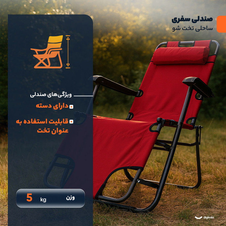 صندلی مسافرتی ساحلی تختخوابشو یکی از راحتترین و پرفروشترین صندلیهای تاشو برای مسافرت، کمپینگ و استفاده کنار استخر است که در رنگبندیهای متنوع عرضه میشود. این صندلی قابلیت تبدیل شدن به حالتهای مختلف را دارد؛ میتوان از آن به عنوان صندلی ساده برای نشستن، صندلی شیبدار یا تختخوابشو برای دراز کشیدن و ریلکس کردن زیر نور آفتاب یا کنار ساحل استفاده کرد و به همین دلیل به مدلهای چندکاره معروف است. فریم و شاسی صندلی از لولههای مقاوم ساخته شده و جنس پارچه آن برزنت ضخیم است که دوام بالای محصول را تضمین میکند. این صندلی قابلیت تحمل وزن تا ۱۵۰ کیلوگرم را دارد.