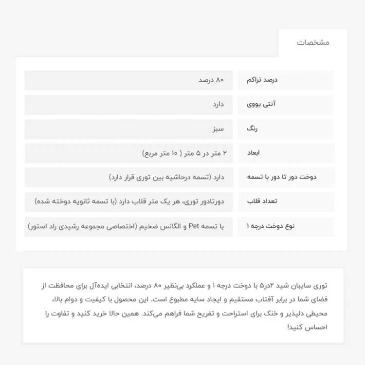 توری شید، 2در5، با 80 درصد تراکم، انتی یووی دار بوده که از اشعه خطرناک خورشید جلوگیری میکند، دوخت درجه 1 (منظور تسمه و دوخت بسیار قویتر میباشد) ، تسمه محکم دور کار و هر متر یک قلاب با تسمه ثانویه دوخت خورده است، مشخصات کامل محصول در تصویر آخر آمده است.