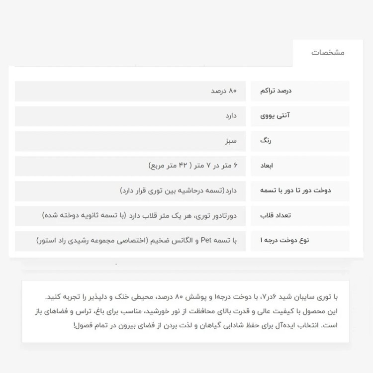 توری شید، 6 در7، 80 درصد انتی یووی دار میباشد که از اشعه خطرناک خورشید جلوگیری میکند، دوخت درجه 1 (منظور تسمه و دوخت بسیار قویتر میباشد) ، تسمه محکم دور کار و هر متر یک قلاب با تسمه ثانویه دوخت خورده، این محصول اماده هست. این ابعاد اماده و بسته بندی شده هست، زمان تحویل به پست، بسته به زمان ثبت سفارش، بین 1 تا 3 روز میباشد.