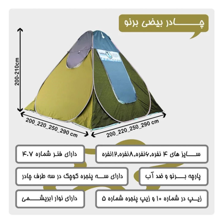 این چادر مخصوص ۱۲ نفر نشسته و یا ۶ تا۷ نفر خواب یا دراز کشیده میباشد