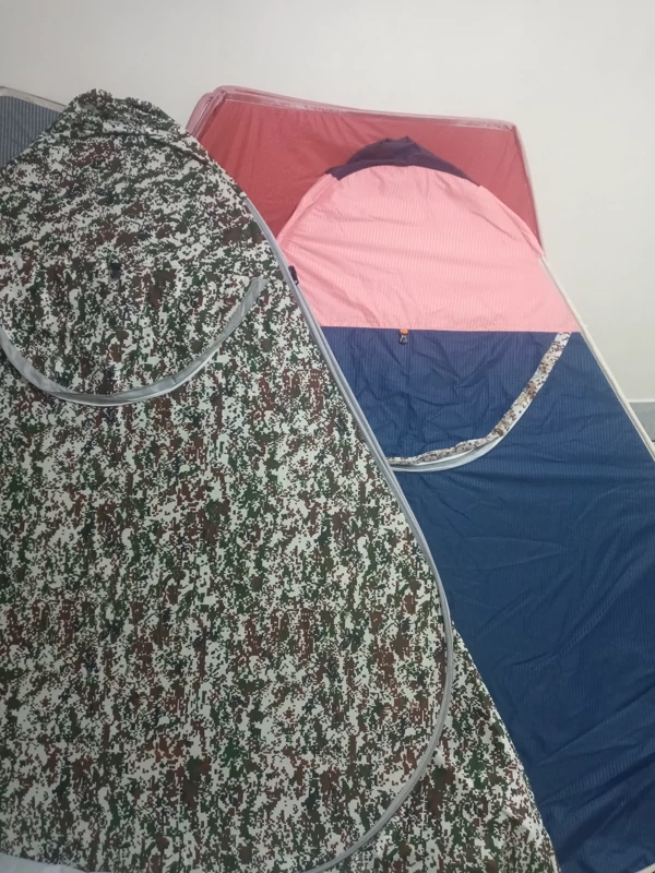 دارای حلقه و کیسه مهاری ،سه پنجره توری دار و همچنین درب توری دار حریر ،یکی از پنجره به سمت بالا باز میشود جهت تهویه بهتر هوای داخل چادر( به عنوان هواکش)