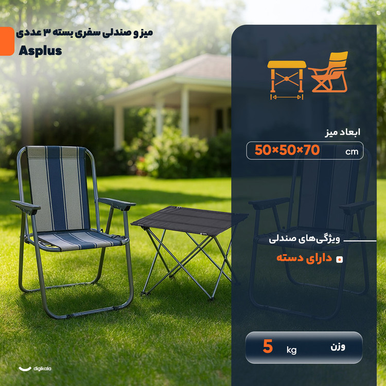 میز سفری تاشو با پایه آهنی دارای ابعاد باز ۷۰×۵۰×۵۰ سانتیمتر و ابعاد بسته ۵×۵×۷۵ سانتیمتر است. تحمل وزن سطح میز بین ۵۰ تا ۶۵ کیلوگرم بوده و ابعاد صندلی در حالت بسته ۶۰×۶۰×۸ سانتیمتر است. صندلی قادر به تحمل وزن تا ۱۲۰ کیلوگرم میباشد. این محصول دارای کاور مخصوص برای میز و صندلی است.